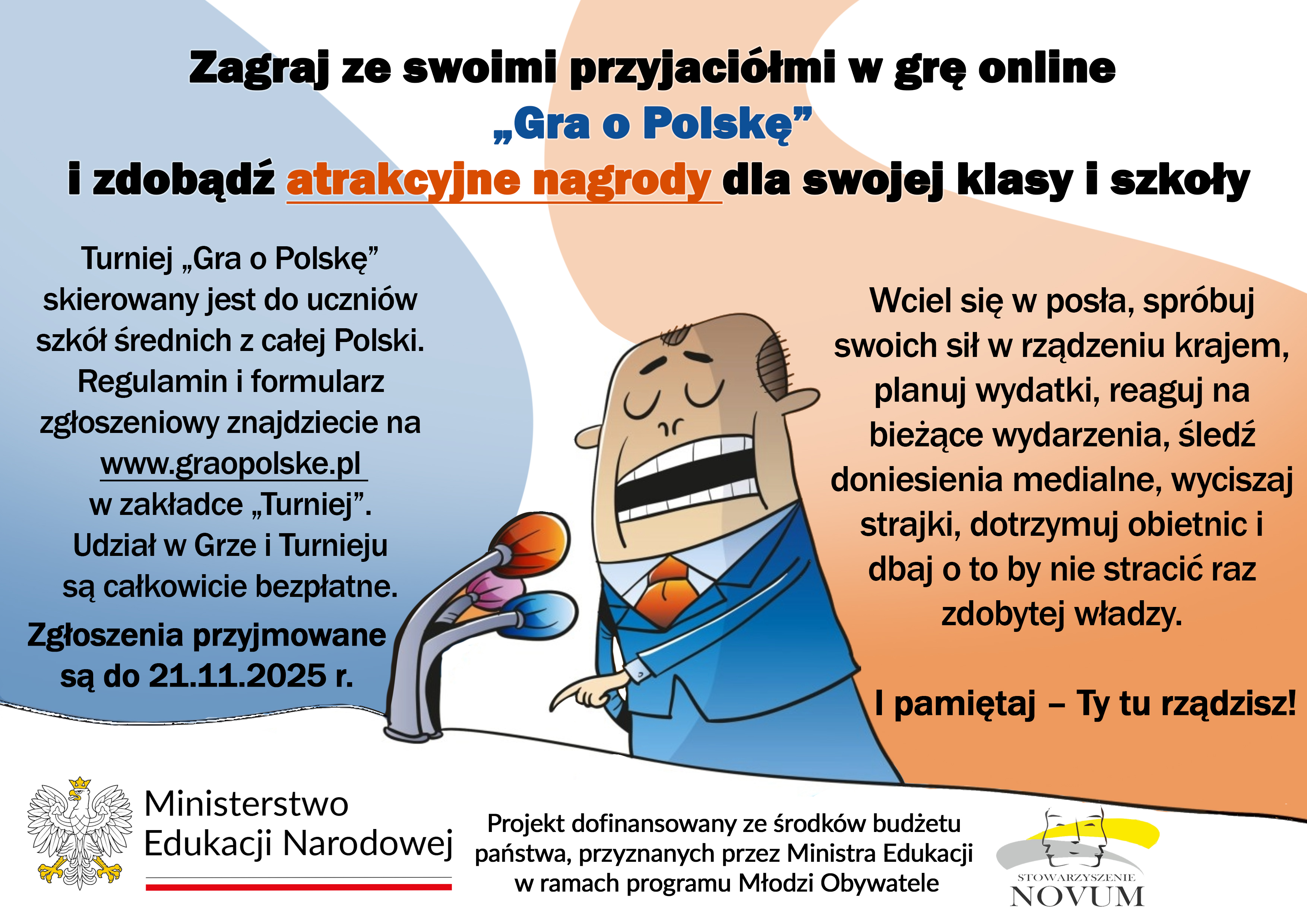 Zachęcamy uczniów szkół średnich do udziału w Ogólnopolskim Turnieju Gry Online „Gra o Polskę”. W ramach Turnieju wygrać można nagrody dla klasy szkolnej oraz dla samej szkoły. Gra jest całkowicie bezpłatna, nie wymaga pobierania ani instalacji. Grę stworzyliśmy w ramach zadania zleconego przez Ministerstwo Edukacji Narodowej, a jej głównym założeniem jest pokazanie mechanizmów rządzenia krajem. Gracze (uczniowie) w zespołach wcielają się w posłów i podejmują decyzje, które wpływają na losy państwa. Celem graczy jest nie utracić władzy i przetrwać całą kadencję, a by tego dokonać muszą zaspokajać potrzeby obywateli przy ograniczonych środkach budżetowych.